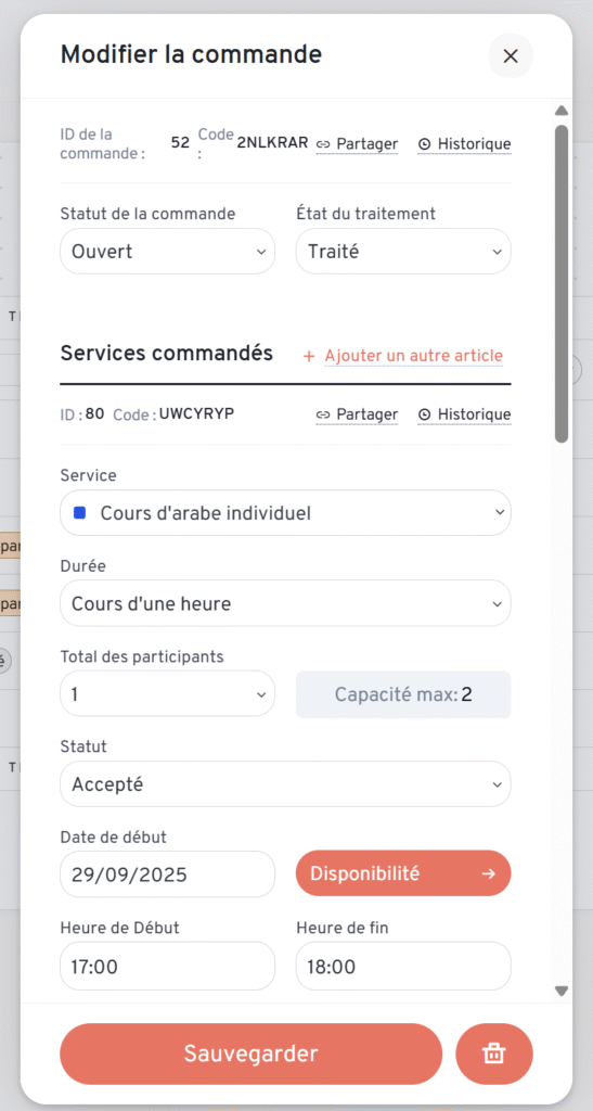 En pratique, utilisez le statut de la commande pour votre organisation personnelle, afin de savoir quelles commandes requièrent encore votre intervention. Utilisez l’état du traitement pour vous remémorer l’avancement concret de chaque commande, notamment si elle comporte plusieurs éléments à réaliser. Par exemple, si un élève a commandé 5 cours, vous pourriez laisser le statut « Ouvert » jusqu’à ce que tous les cours soient faits et payés, mais mettre l’état du traitement à « Traité en partie » après les 2 ou 3 premiers cours effectués, puis finalement à « Traité » une fois les 5 cours terminés.