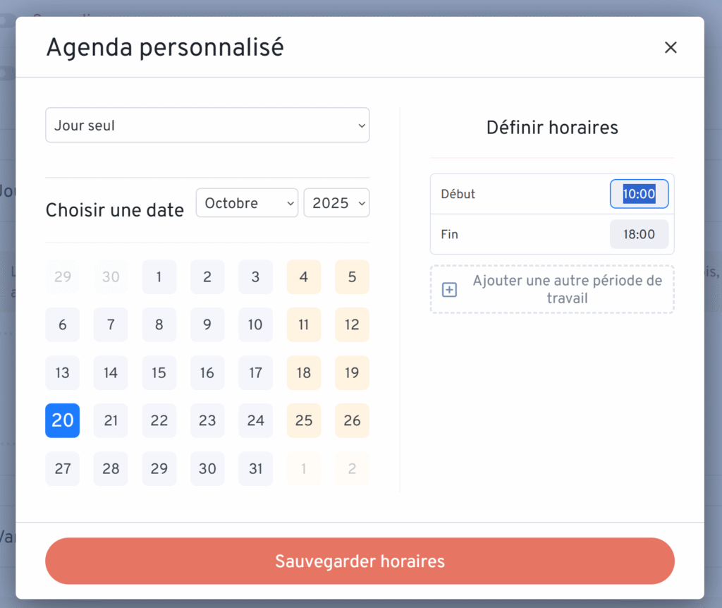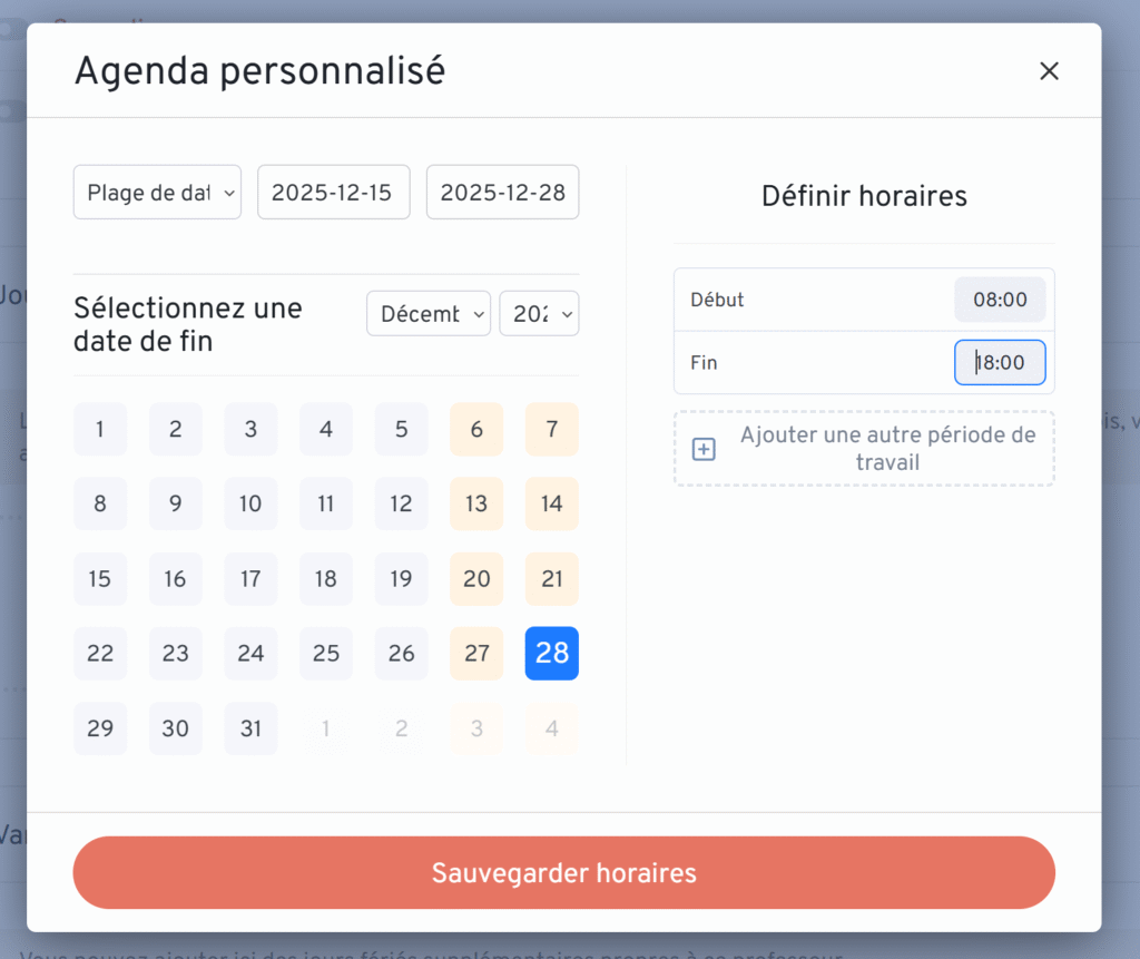 • Vous voulez être plus bien plus disponible pendant les vacances de décembre ? Définissez une plage de dates avec des horaires élargis (ex. 8h à 18h non-stop).